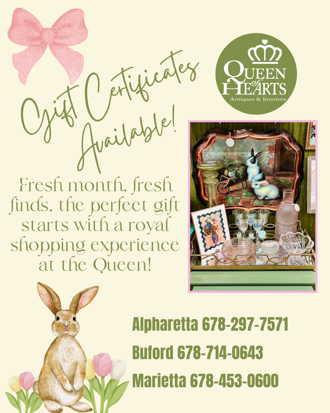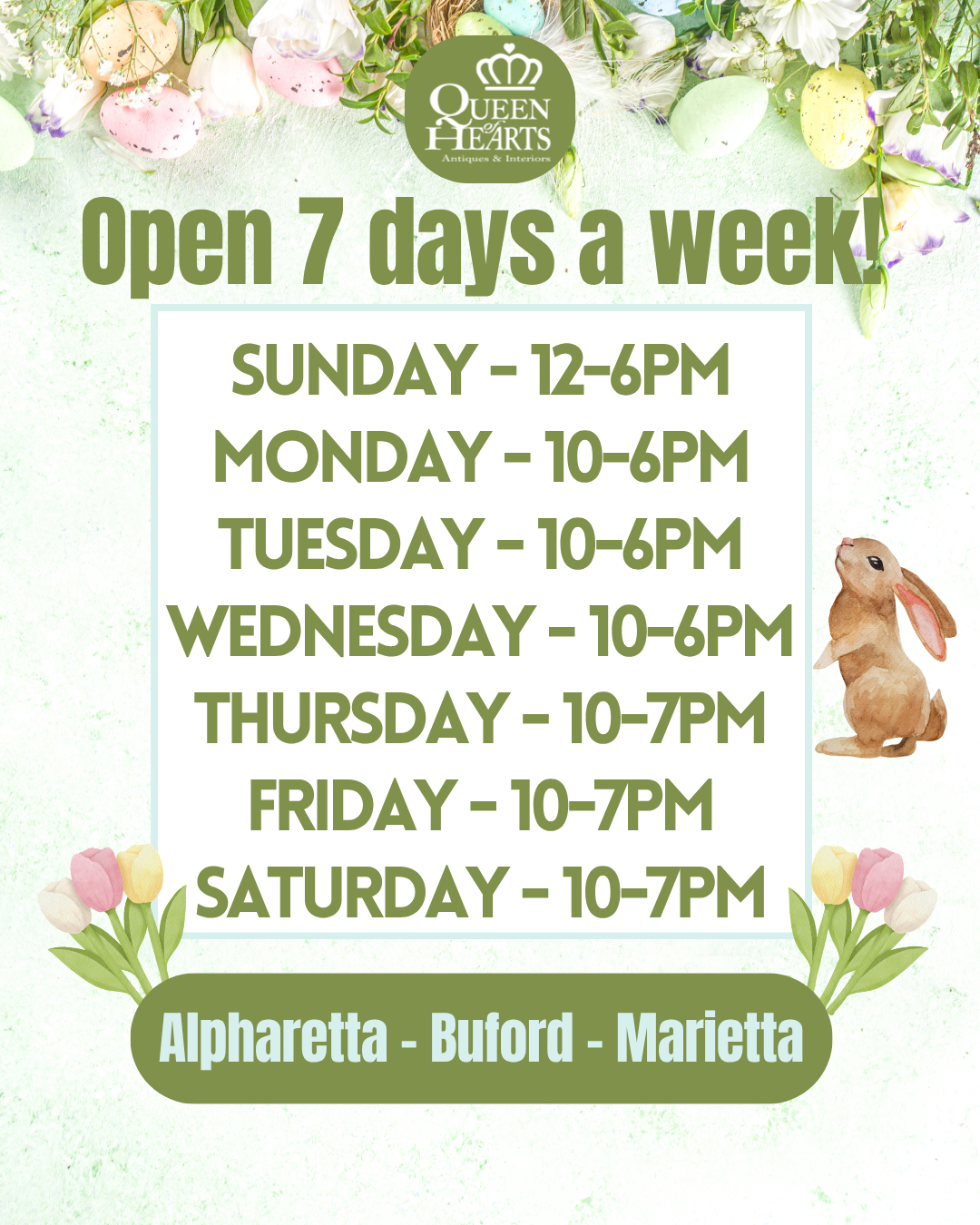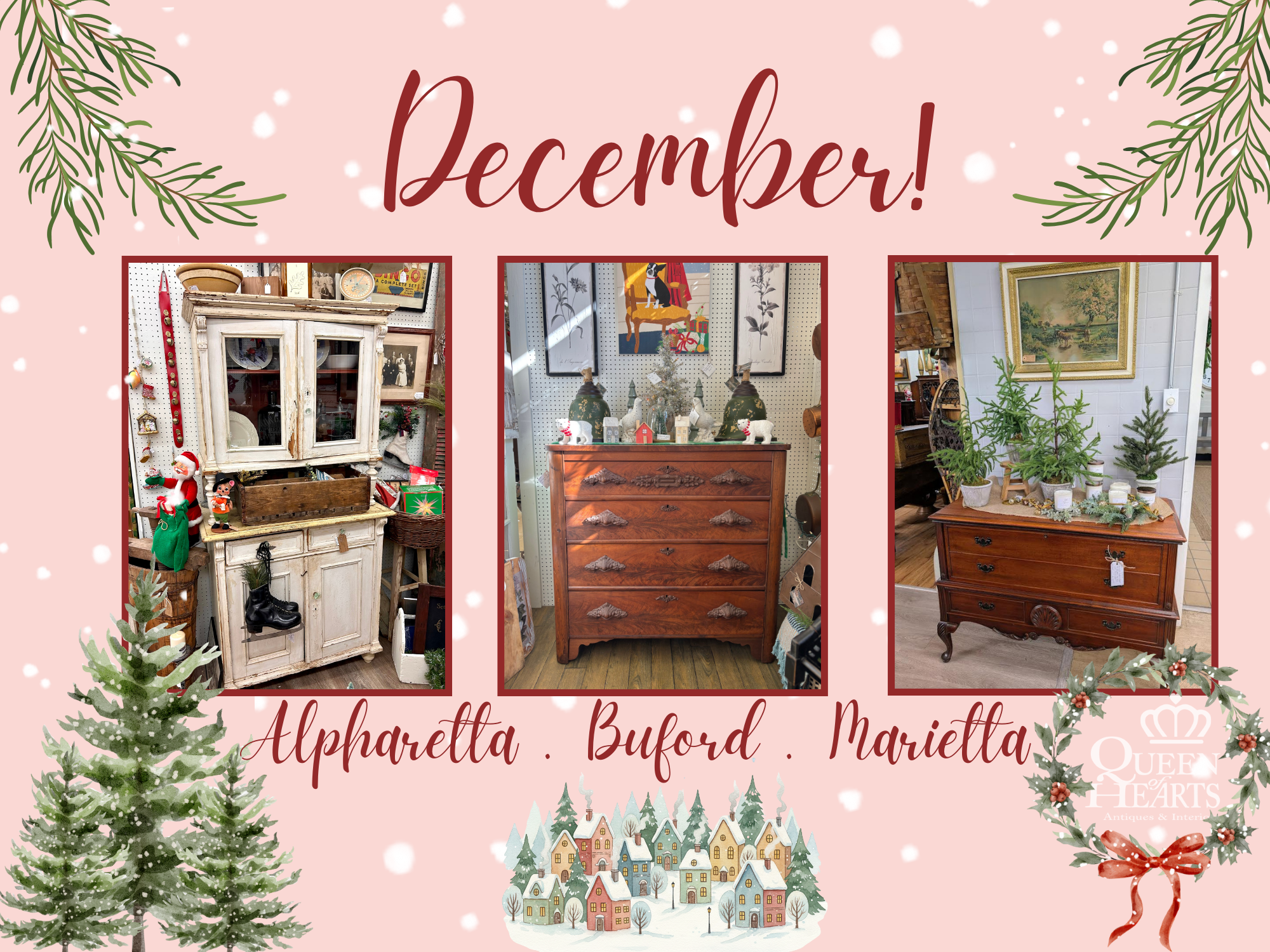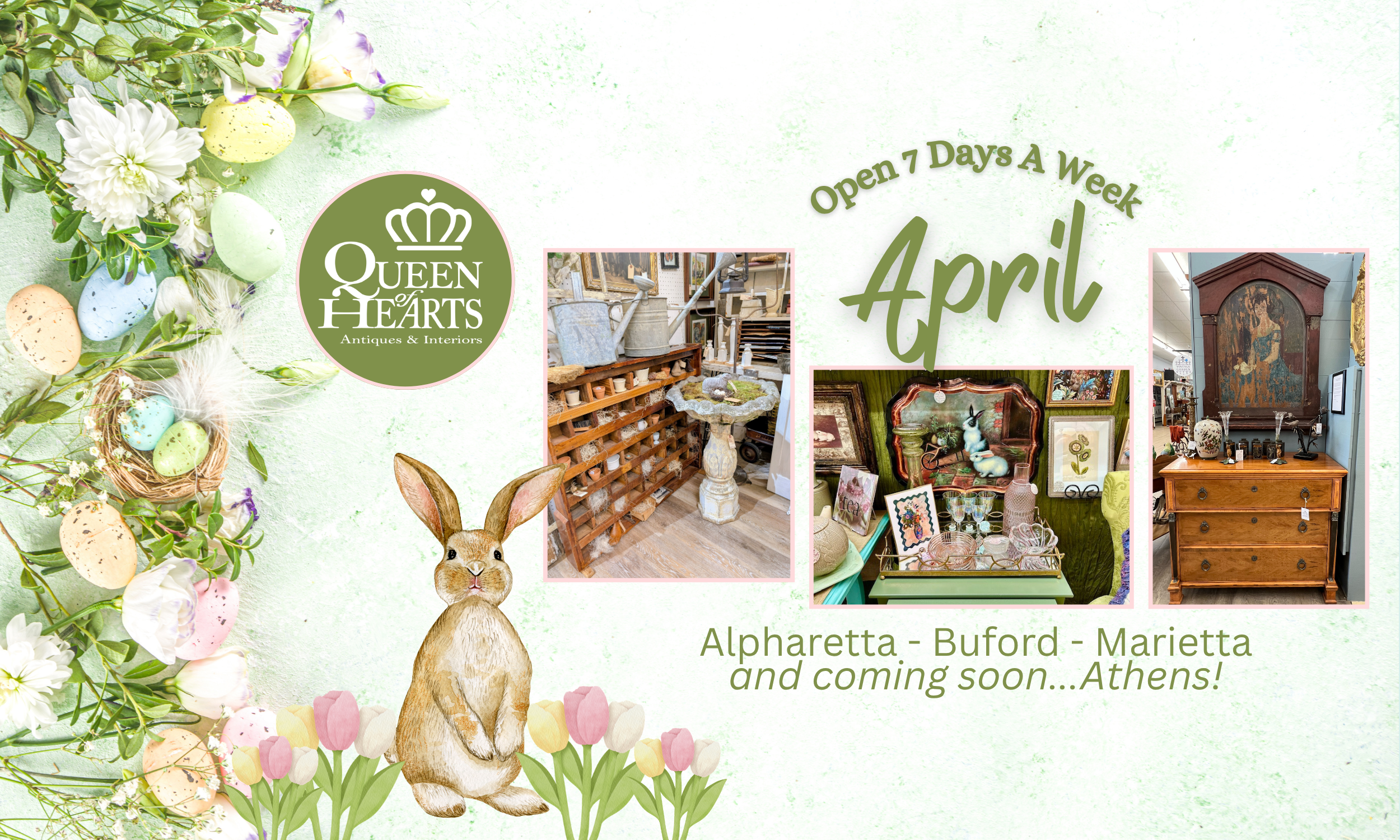 Queen of Hearts Antiques & Interiors is the largest collection of Antique Malls in North Georgia. We have locations conveniently located in Alpharetta, Buford and Marietta, Georgia, hosting over 550 Dealer-Merchants. We offer vintage, antique & new furniture, lighting, home decor accessories as well as vintage and antique collectibles, sports memorabilia and so much more! We also carry Dixie Belle Paint, Farmhouse Paint, Wise Owl Paint & Fusion Paint for your DIY projects and offer workshops monthly!
