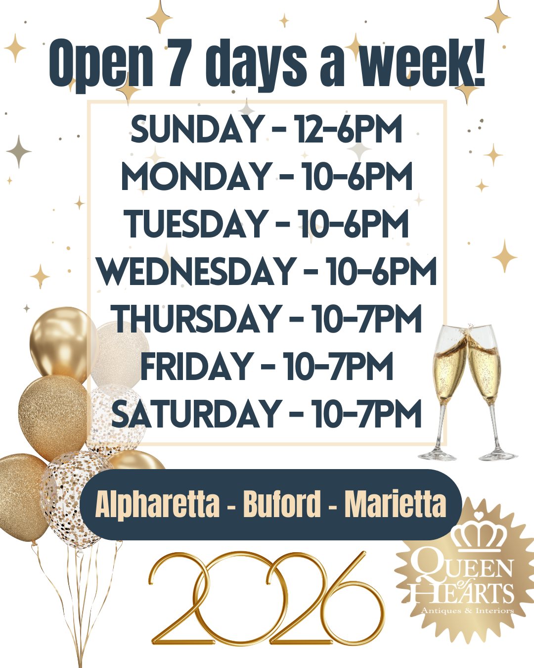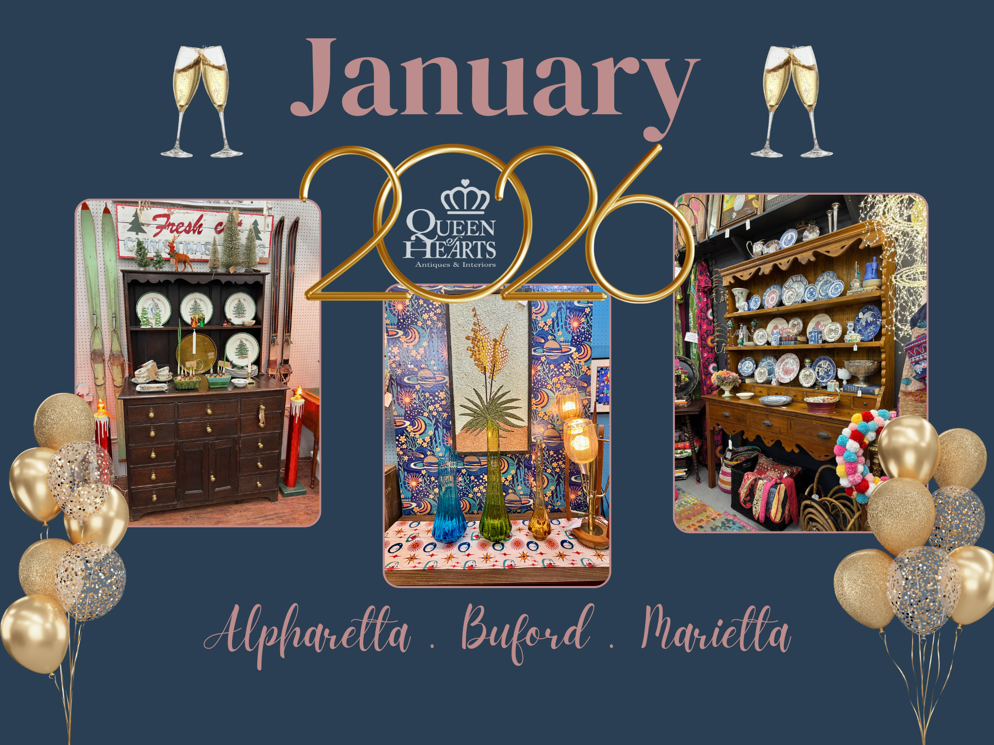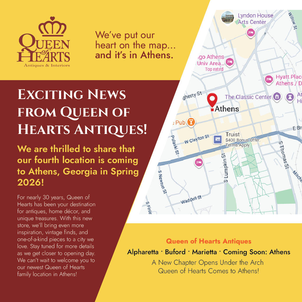 Queen of Hearts Antiques & Interiors is the largest collection of Antique Malls in North Georgia. We have locations conveniently located in Alpharetta, Buford and Marietta, Georgia, hosting over 550 Dealer-Merchants. We offer vintage, antique & new furniture, lighting, home decor accessories as well as vintage and antique collectibles, sports memorabilia and so much more! We also carry Dixie Belle Paint, Farmhouse Paint, Wise Owl Paint & Fusion Paint for your DIY projects and offer workshops monthly!